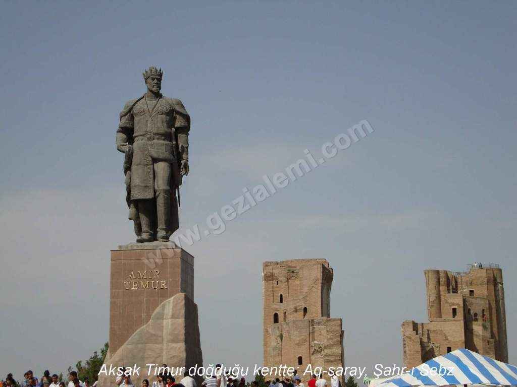 6. günün sabahı Buhara'dan yola çıktık ve Özbeklerin milli kahramanı Amir Timur'un doğduğu kent olan Şahr-ı Sabz'e geldik. Annesi Türk babası Moğol olan Timur'un kurduğu imparatorluk Türk-Moğol İmparatorluğu olarak anılmaktadır. Timur'un doğduğu kent Şahr-ı Sabz yeşil şehir anlamına gelmektedir. Timur doğduğu kente çok büyük bir saray yaptırmış (Aq-Saray) ancak uzun yıllar sonra bu kenti ele geçirenler birçoğunu yıkmışlar. Günümüze kadar ulaşan kalıntılar ise sarayın yapıldığı zamanki boyutları hakkında fikir verebilmektedir. "Bizim gücümüzden şüphe duyanlar gelip yaptığımız binalara baksınlar" diyen Timur, insanı dehşete düşüren gücünü, bıraktığı eserleriyle de göstermektedir.